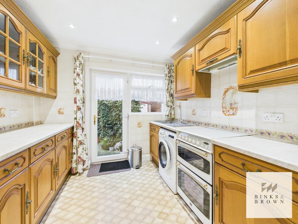 The galley-style kitchen is positioned to the rear of the property and is fitted with oak-fronted cabinetry, offering ample storage and workspace. A well-appointed three-piece family bathroom serves the property.