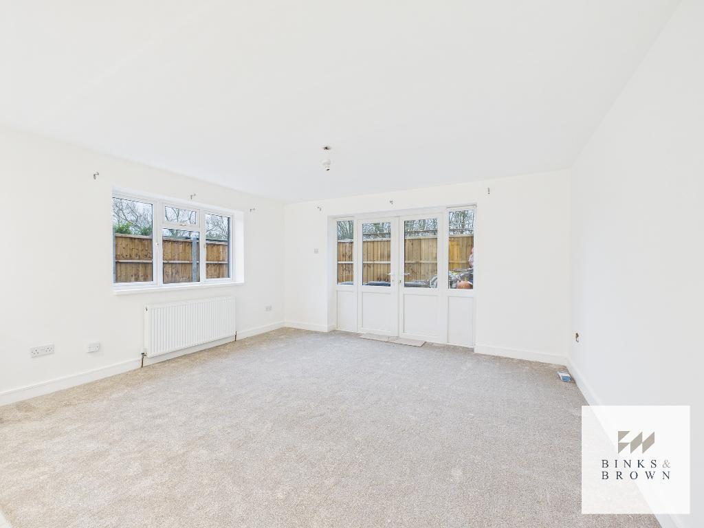 The living area is fully carpeted and enjoys an abundance of natural light, with French doors providing direct access to the rear courtyard, seamlessly blending indoor and outdoor living.