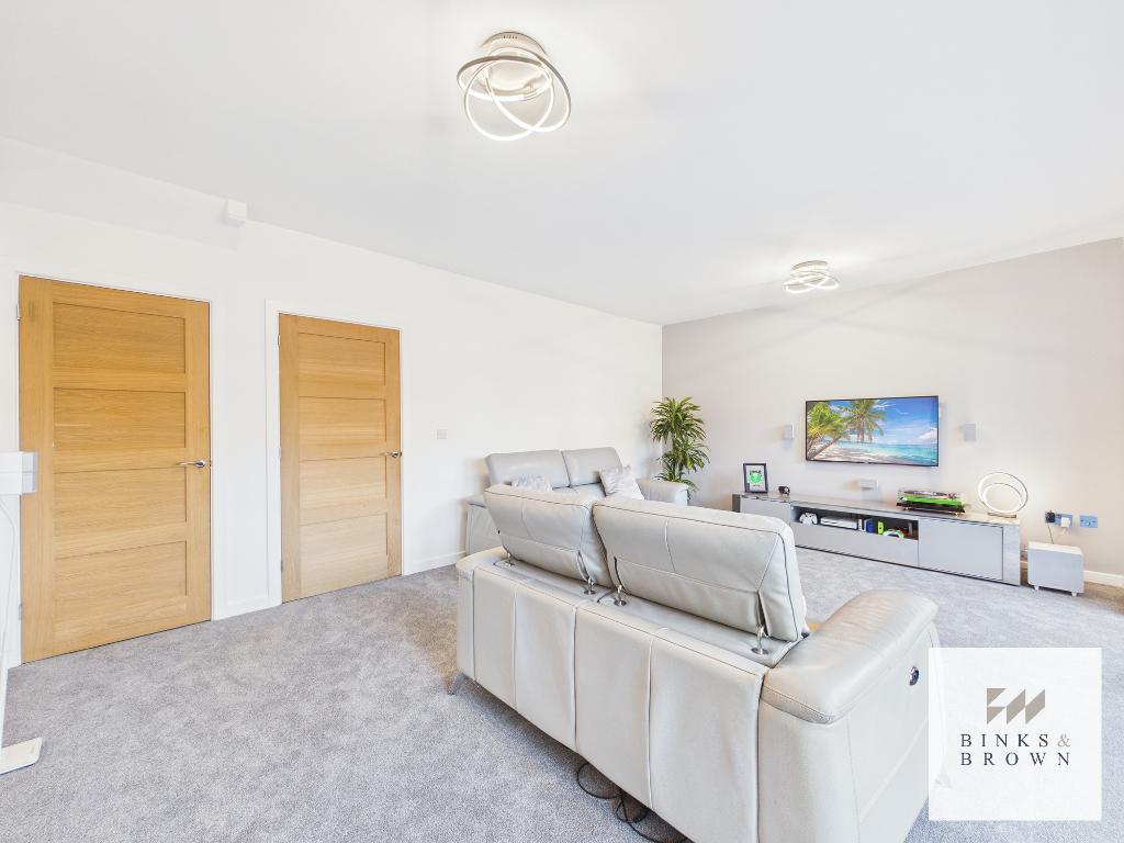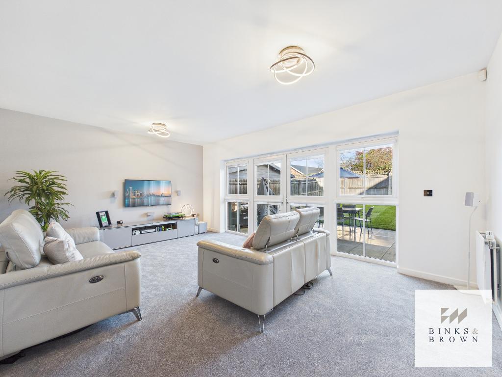 Spanning the rear of the property is the spacious living room, offering a relaxing and sociable environment with wide French doors opening directly onto the rear garden.