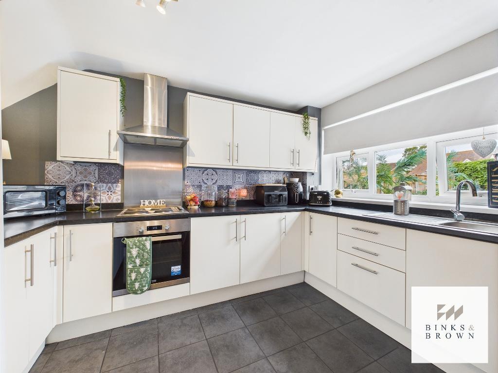 Flowing through, the kitchen/diner forms the heart of the home - a generous, social space fitted with an array of base and eye-level units, an integrated electric oven and hob, and room for a large freestanding fridge/freezer. Perfect for family breakfasts or evening get-togethers.