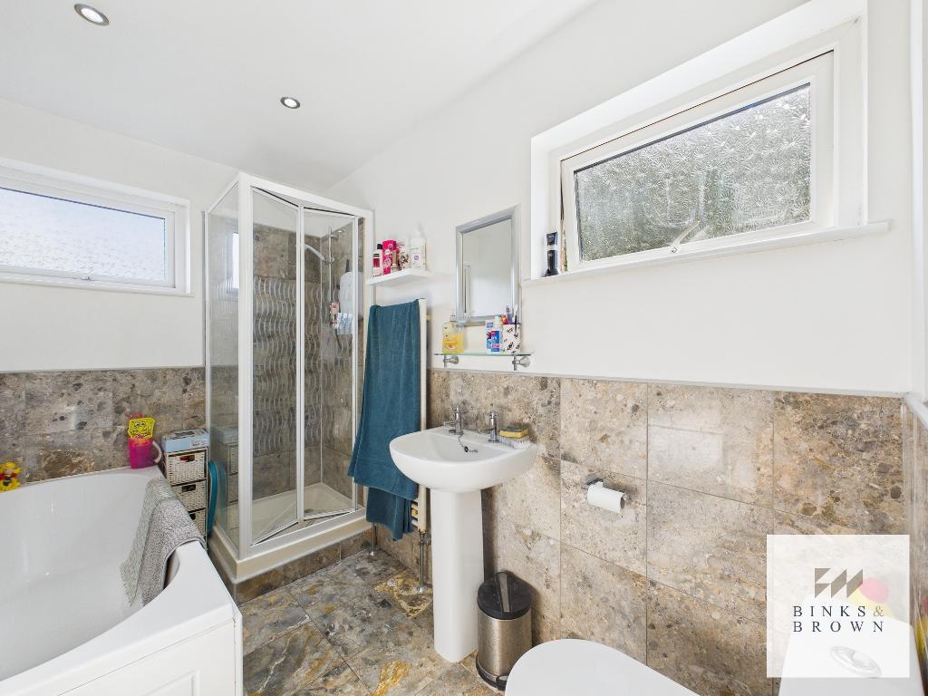 The upper level hosts two generously sized double bedrooms alongside a comfortable single bedroom. All are served by the family bathroom, appointed with both a bath and a separate shower.