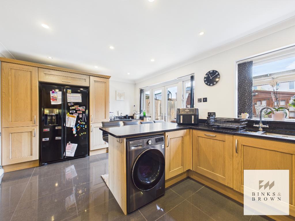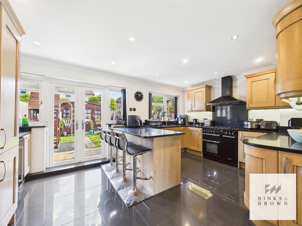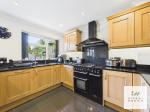 The kitchen has been fitted with an extensive array of oak-effect shaker cabinetry, enhanced by sleek granite worksurfaces and a range-style oven. Designed with family life in mind, the breakfast area provides ample space for dining and everyday gathering.