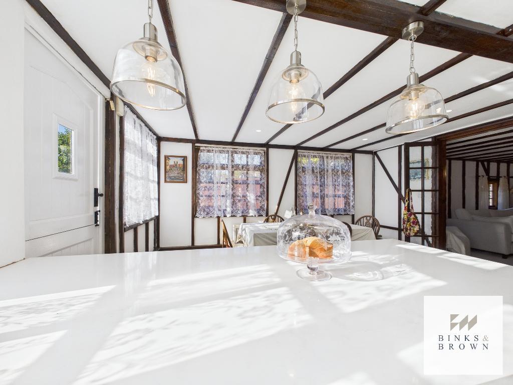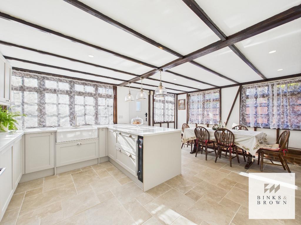 The rear of the property opens to a spectacular newly installed kitchen/diner - the true heart of this cottage. Featuring cashmere cabinetry, quartz work surfaces, and a double butler sink, this space effortlessly combines high-end finishes with timeless cottage appeal. Large windows and glazed doors draw the garden views inside, making it ideal for family dining and relaxed gatherings.
