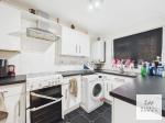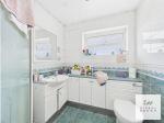 The adjacent kitchen is positioned to the rear, featuring sleek white cabinetry paired with anthracite work surfaces. This space offers ample potential for further modernisation and direct access to the garden, enhancing its functionality for everyday living.