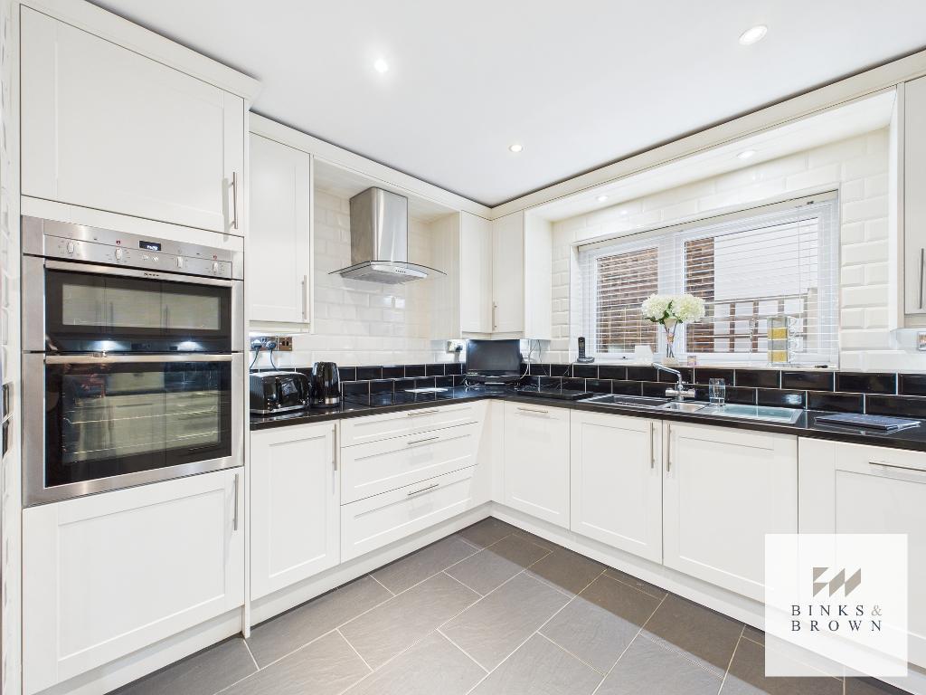 The kitchen is both stylish and practical, finished with shaker-style white cabinetry, contrasting black granite work surfaces, and contemporary metro tiling. A separate utility room houses the washer/dryer, offers space for an additional fridge, and provides access to the ground-floor cloakroom, ensuring everyday functionality is neatly contained.