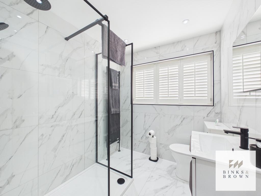 All bedrooms are served by a stunning fully tiled family bathroom featuring a walk-in shower and contemporary black fittings, giving the space a modern and luxurious feel.