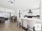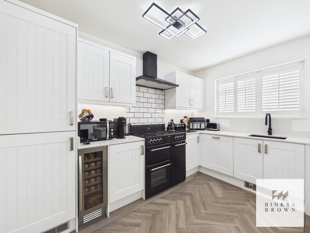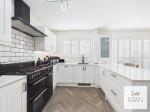 Spanning the rear of the property is an immaculate white country-style kitchen fitted with quartz work surfaces and a range-style cooker, creating a stylish yet highly functional space.