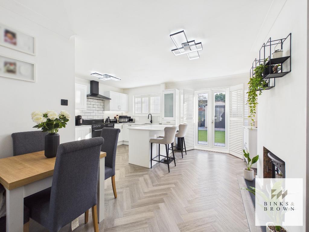 The kitchen flows into the dining area, where a charming log burner provides a cosy focal point. This area is open plan to the sitting room, which features a modern panelled wall and plantation shutters, creating a comfortable and sociable living environment.