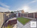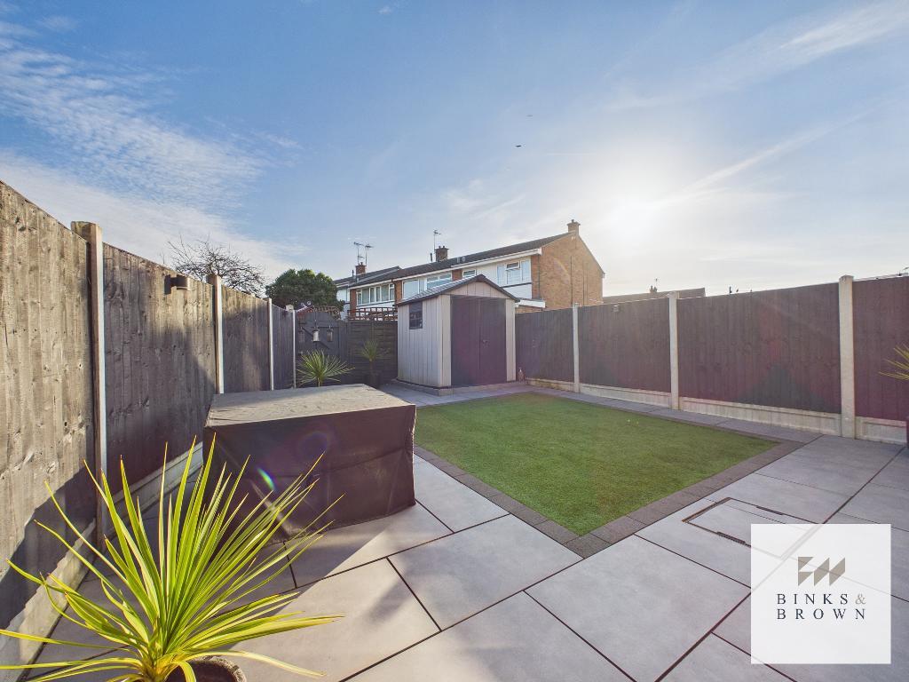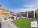 The rear garden has been designed for ease of maintenance and features an artificial lawn surrounded by porcelain tiled patio areas, creating an attractive space for relaxing or entertaining.