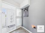 Contemporary fully tiled bathroom with walk-in shower.