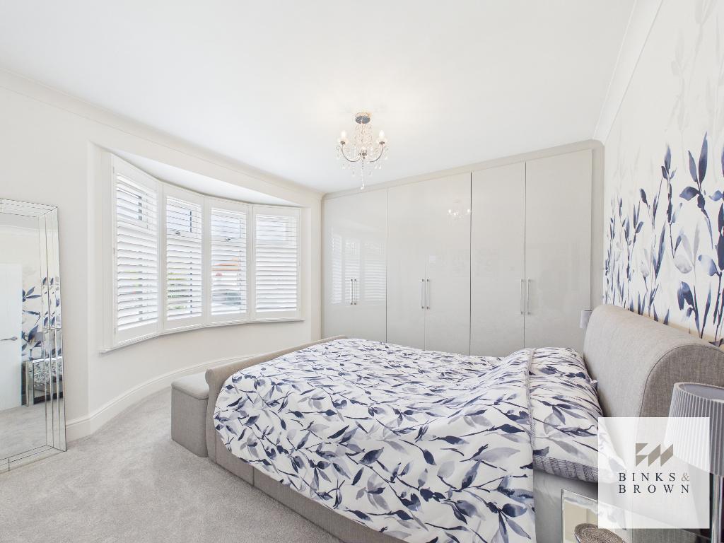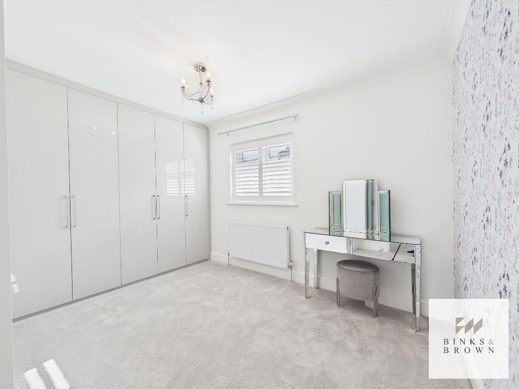 A bright and spacious entrance hallway provides access to all principal rooms. To the front, two generous double bedrooms feature bay windows and plantation shutters. A third ground floor bedroom, currently used as a dressing room, benefits from bespoke cabinetry and offers flexibility as an additional double.
