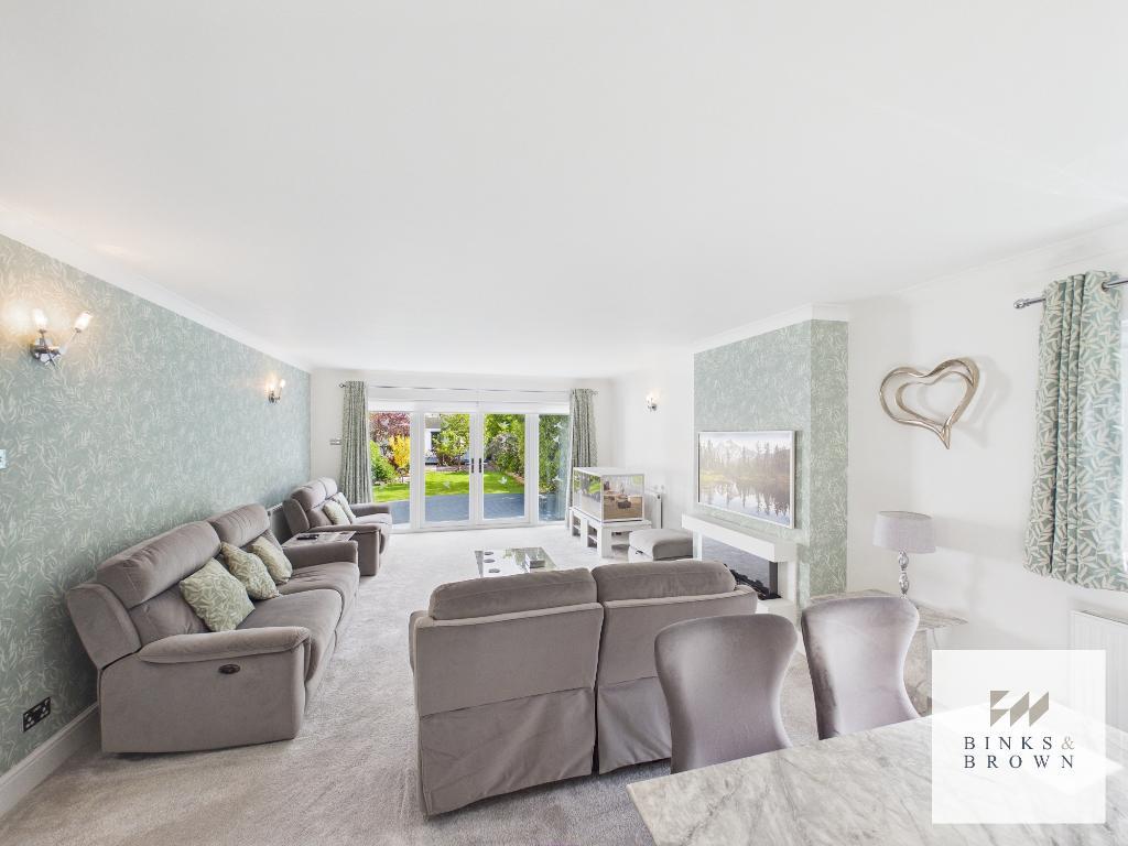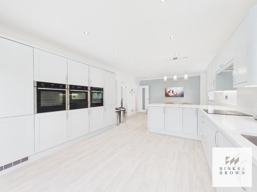 To the rear, the stunning kitchen/diner is fitted with sea foam blue shaker-style units, quartz worktops and a range of integrated appliances including two ovens and a microwave combi. The adjoining family room is impressive in scale, ideal for entertaining and everyday living.