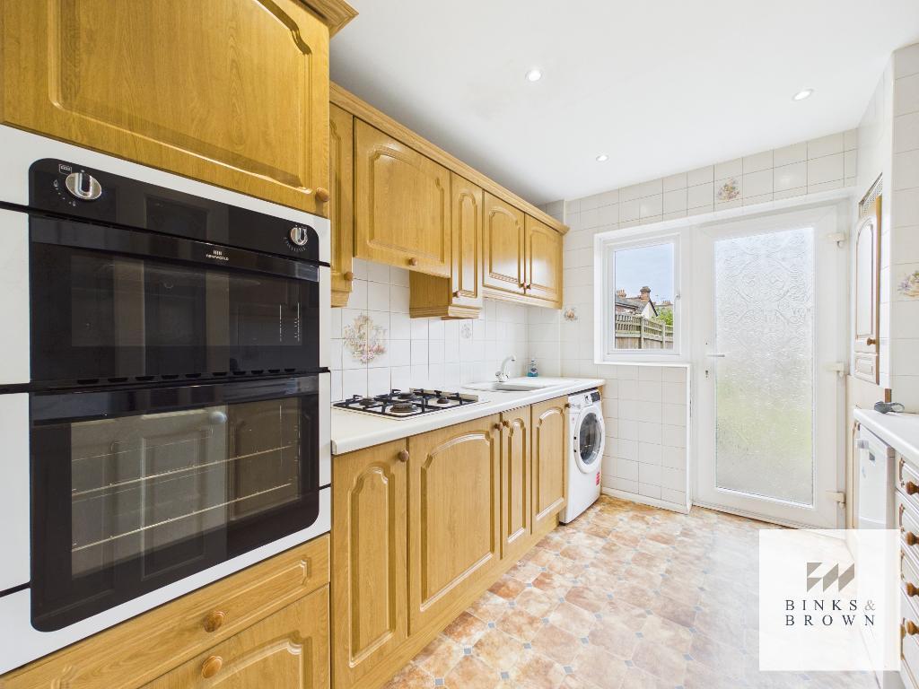 To the rear, the kitchen is fitted with well-maintained oak-effect cabinetry complemented by laminate work surfaces. The layout is functional and offers scope for redesign or extension (subject to planning), making it ideal for those looking to create a modern open-plan kitchen/dining space.